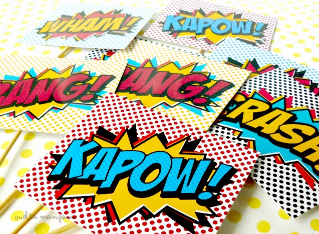 Carteles con onomatopeyas, típicas de los comics, para decorar la mesa dulce.